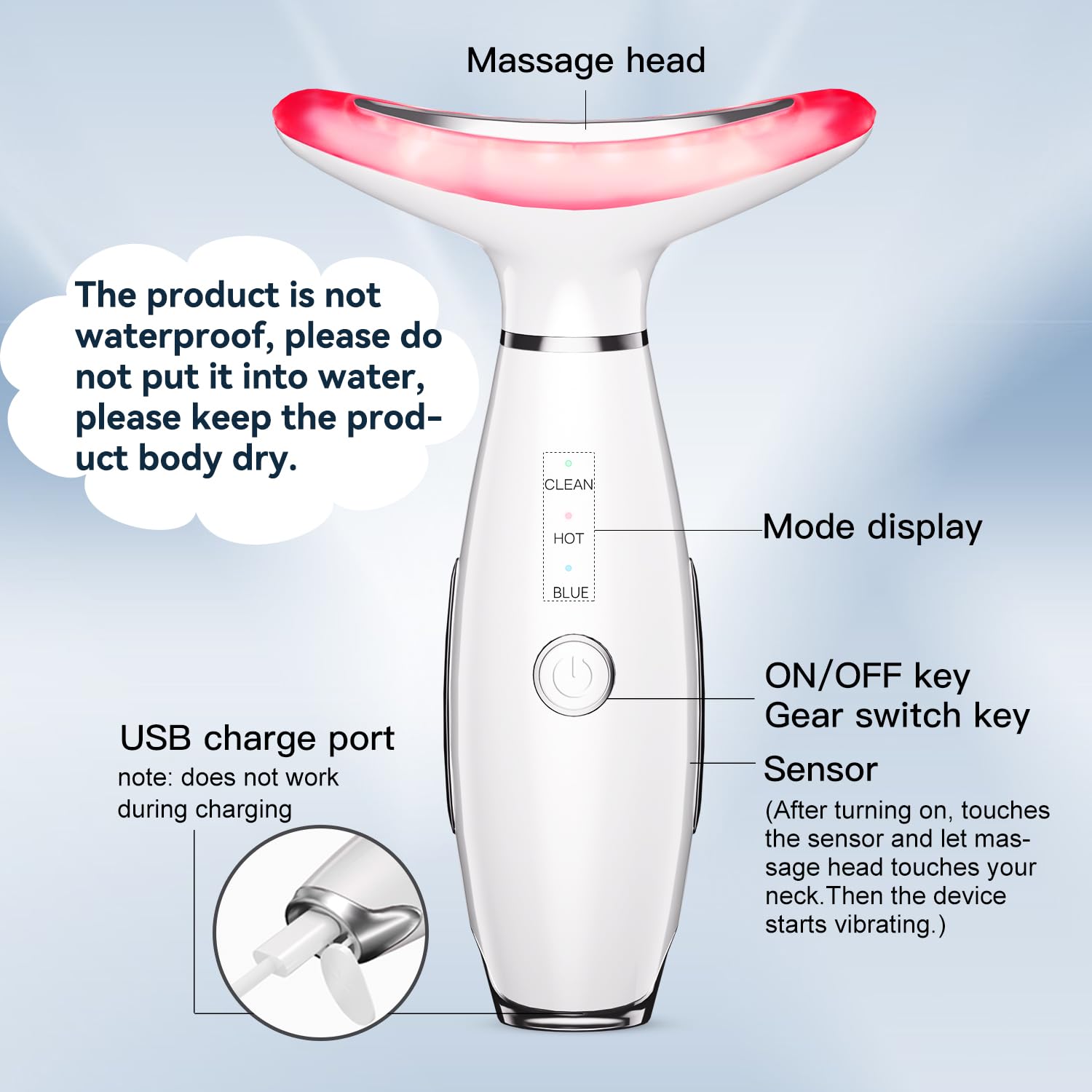 WARM HINT! cap on the device head that please be removed before using. This product is set by human body induction switch, when using ,please device head touch your skin and your hand touch one of the sensing "rings" on either side for the vibration to work.